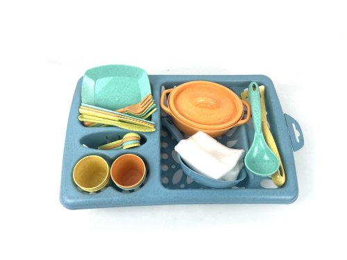Tato ekologická sada nádobí je vyrobena z pšeničného materiálu, což ji činí šetrnou k přírodě. Obsahuje 27 kusů, které jsou ideální pro dětské hraní na vaření a stolování.