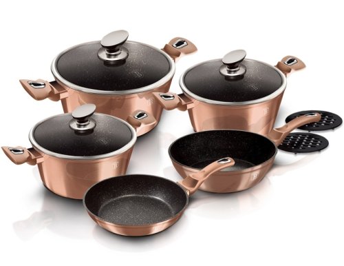 Luxusní sada nádobí BerlingerHaus z kolekce Rosegold Metallic Line v atraktivním designu zaujme nejen vzhledem, ale i špičkovými vlastnostmi. Díky 3vrstvému nepřilnavému povrchu s mramorovým efektem se potraviny nepřipalují a nádobí se snadno čistí. Sada je vhodná pro zdravé vaření s minimem tuku a pro všechny typy sporáků včetně indukce.