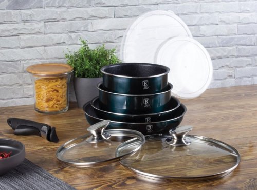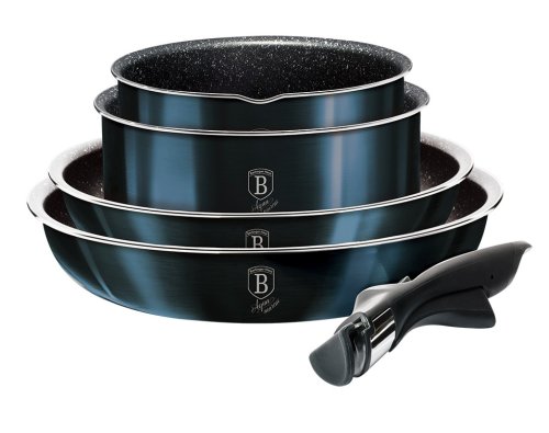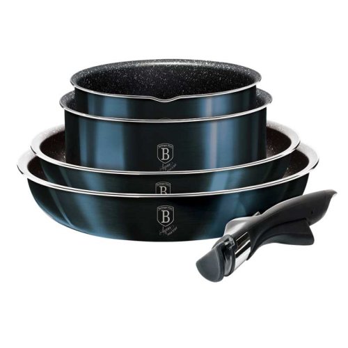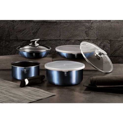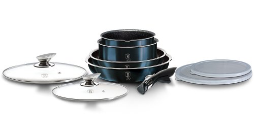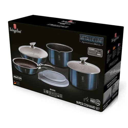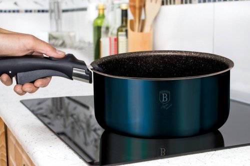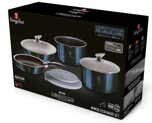 Luxusní sada nádobí BerlingerHaus z kolekce Aquamarine Metallic Line v atraktivním designu zaujme nejen vzhledem, ale i špičkovými vlastnostmi. Díky 3vrstvému nepřilnavému povrchu s mramorovým efektem se potraviny nepřipalují a nádobí se snadno čistí. Sada je vhodná pro zdravé vaření s minimem tuku a pro všechny typy sporáků včetně indukce.