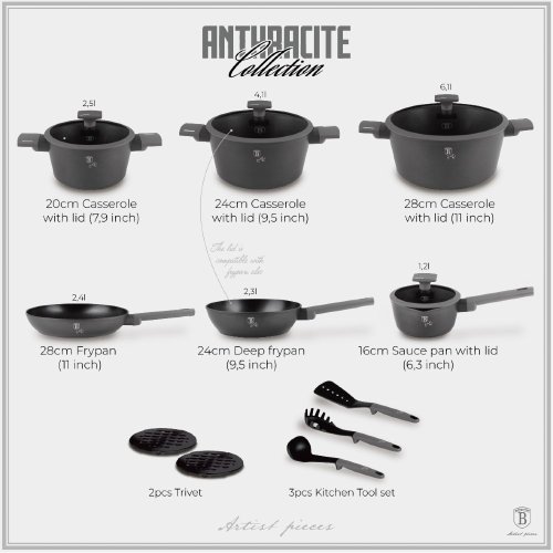 Berlingerhaus Antracit Collection je moderní 15dílná sada nádobí s titanovým povrchem, která zaujme minimalistickým stylem, odolným materiálem a praktickými funkcemi. Díky třívrstvému nepřilnavému povrchu TitanPro připravíte pokrmy zdravě, s minimem tuku a bez připalování.