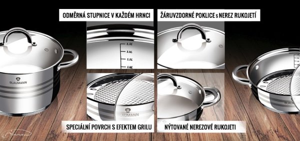Hledáte vhodnou sadu nádobí do vaší kuchyně? Sadou získáte všechny potřebné nádoby na vaření, ať už budete vařit pro sebe nebo pro více osob. Velkou výhodou je, že můžete objednat najednou více nádobí od ověřeného výrobce BLAUMANN. Sadu nádobí sjednocuje jednotný design, navíc nerezová barva celé sady je univerzální a vyjímat se bude v každé kuchyni.