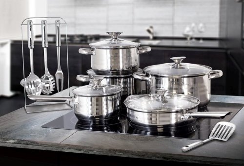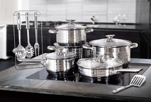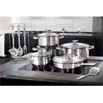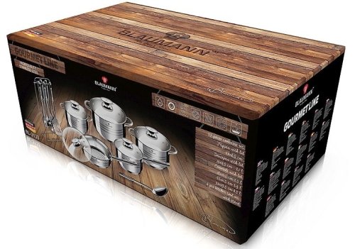 Bohatě vybavená sada nerezového nádobí od značky Blaumann. Kromě hrnců a pánve obsahuje sada také praktický stojan s kuchyňským náčiním. Díky pevné konstrukci se všechny hrnce i pánve řady Gourmet Line mohou pochlubit vynikající tepelnou vodivostí i rychlým ohřevem v troubě - pro vždy dokonalé výsledky při vaření i pečení. V troubách zvládne nádobí teploty až do 220°C. Hrnce i pánve z řady Gourmet lze použít na všechny druhy sporáků a lze je libovolně kombinovat i s jednotlivými hrnci z nabídky Gourmet Line.