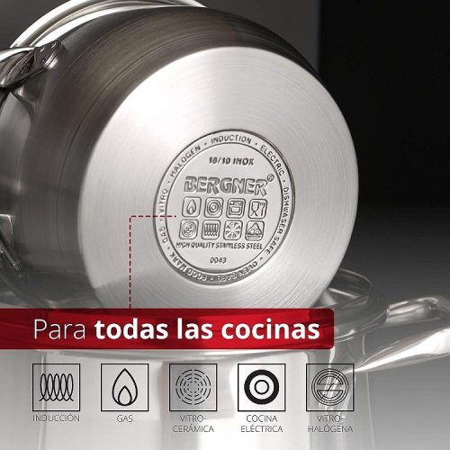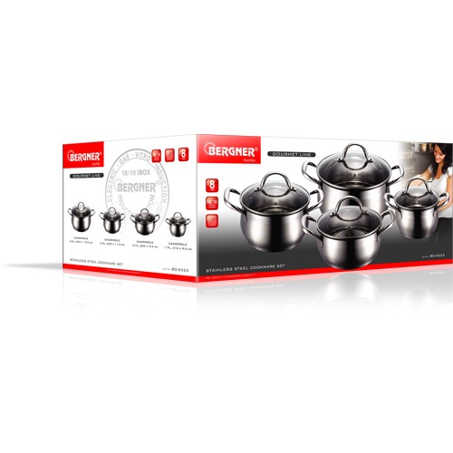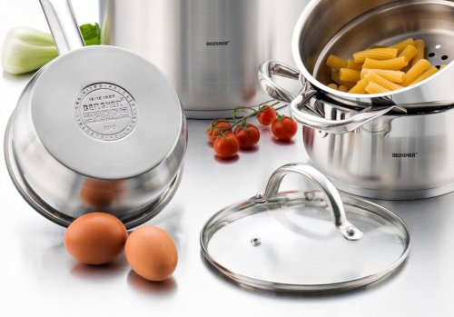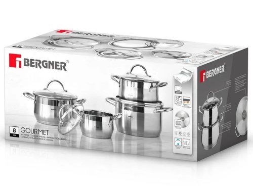 -Indukční nádobí Bergner-materiál: nerezová ocel 18/10-stříbrná barva-sada obsahuje:-hrnec průměr 16 x 7,5 cm, 1,8 l-hrnec průměr 16 x 9,5 cm, 2 l-hrnec průměr 20 x11,5 cm, 3 l-hrnec průměr 24 x 13,5 cm, 6 l-skleněné pokličky