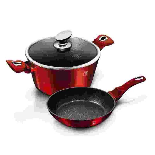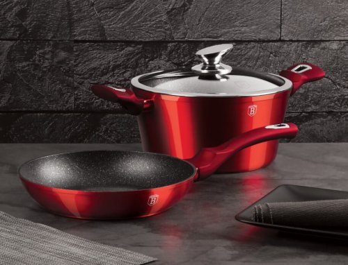 - materiál: kovaný hliník s mramorovým povrchem- barva: červená burgundy, metalická- Sada 3 ks obsahuje:- Pánev pr. 24 x 5 cm- Hrnce s poklicí pr. 24 x 12 cm- 3 vrstvý nepřilnavý povrch s mramorovým …