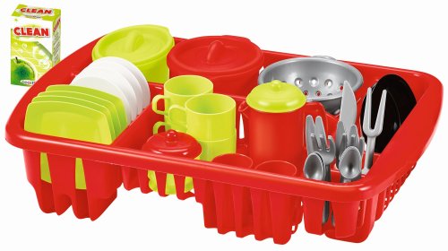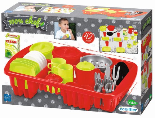 Odkapávač se sadou nádobí obsahuje talíře, hrnečky s podšálky, příbory, sadu hrnců a kuchyňské náčiní, vč. prostředku na umývaní nádobí. Rozměry: 43,5x30,5x13,5 cm.
