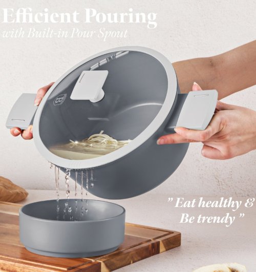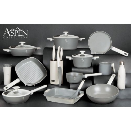 Univerzální nádobí s titanovým povrchem v šedém designu Aspen Collection. Moderní minimalistický design nádobí vás jistě zaujme hned na první pohled. Matný šedý povrch nádobí je navíc velmi praktický při dlouhodobém používání. Vnitřní vrstva je potažena 3vrstvým titanovým povrchem, který je charakteristický svou dokonalou nepřilnavostí. Připravované pokrmy se tak nepřipalují a díky tomu se nádobí velmi snadno čistí. Zároveň je vhodný pro zdravé vaření s minimem tuku nebo oleje, v závislosti na použitých surovinách klidně i bez jedinné kapky tuku. Titanový povrch, stejně jako ostatní použité materiály, neobsahují žádné škodlivé látky, vaření je tak zcela zdravé a hygienické. Zesílené Turbo indukční dno z nerezové oceli je kompatibilní se všemi druhy varných desek a spolehlivě funguje také na indukci. Jistě oceníte tepelně izolovanou rukojeť, která se při vaření nezahřívá a zůstává stále chladná. Nádobí Aspen je vhodná pro každodenní vaření, dušení i smažení, perfektně bude vypadat i při servírování hotových jídel přímo na váš stůl.
