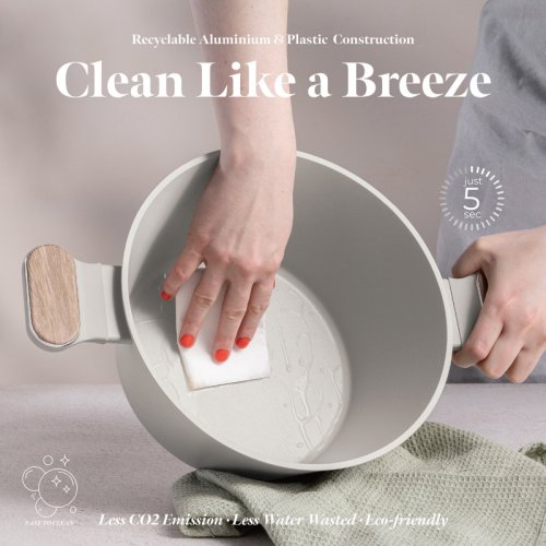 Třívrstvý titanový povrch je navržen tak, aby vydržel každodenní výzvy. Nelepí, nepřipaluje, snadno se čistí a přitom neobsahuje škodliviny – pro zdravější a pohodlnější vaření.