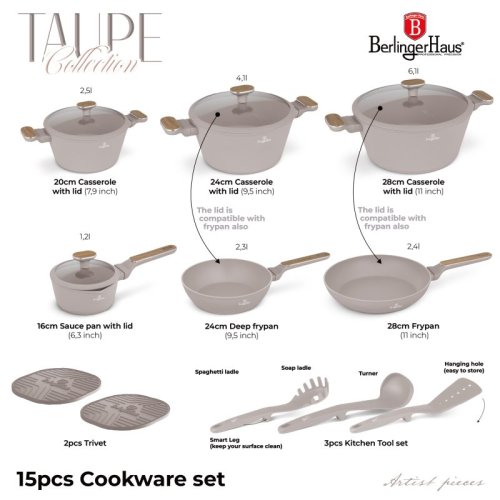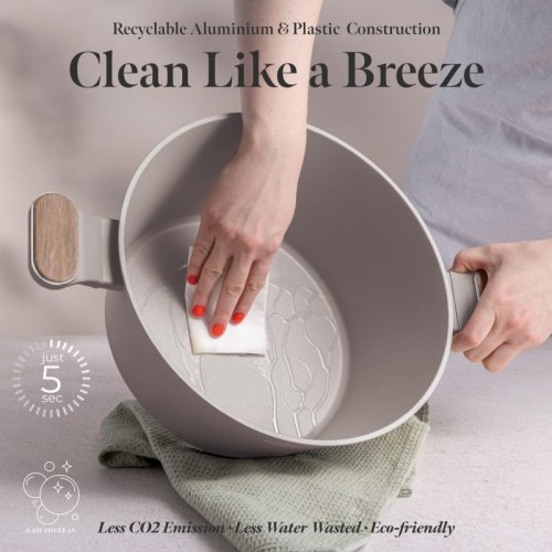 Objevte dokonalé spojení elegantního designu, moderní funkčnosti a nepřekonatelné kvality. Tato sada v jemném matném šedohnědém provedení s detaily ve vzhledu světlého dřeva je skutečnou ozdobou každé kuchyně. Vaření s ní není jen povinnost – je to zážitek, který si zamilujete.