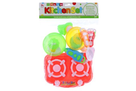 Plastová sada nádobí. Sada obsahuje vařič, pánvičku s pokličkou, hrnec s pokličkou, obracečky, příbor a 4 ks potravin. Baleno v sáčků. Rozměry balení cca 22x32x3 cm. Věk 3+
