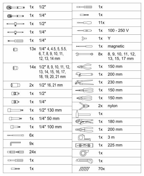 Sada obsahuje celou řadu kleští, šroubováků, gola