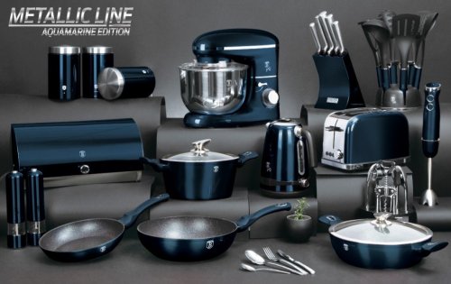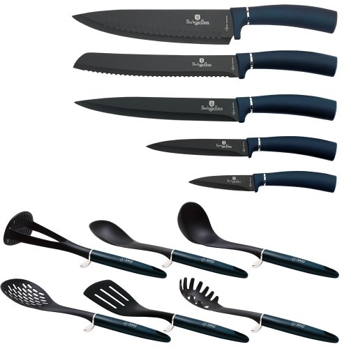 Sada nožů a kuchyňského náčiní ve stojanu 12 ks Aquamarine Metallic Line je výbornou alternativou pro kuchaře různých úrovní, na jejíž výrobu byl použit kvalitní materiál: nerez ocel s nepřilnavým povrchem, vynikají perfektní ostrostí čepele a designem. Velmi oceníte i ergonomicky tvarovanou rukojeť, díky které se vám nože budou skvěle držet. Celá sada je dílem výrobce BERLINGERHAUS, jež se výrobě nožů věnuje poměrně dlouho a jsou řádně odzkoušeny.