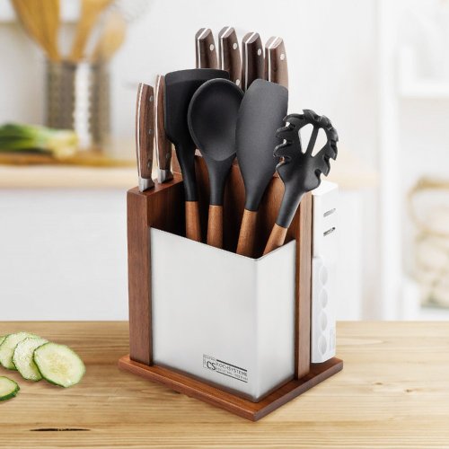Sada nožů a kuchyňského náčiní ve stojanu 12 ks SOLTAU je výbornou alternativou pro kuchaře různých úrovní, na jejíž výrobu byl použit kvalitní materiál: nerez ocel s nepřilnavým povrchem, vynikají perfektní ostrostí čepele a designem. Velmi oceníte i ergonomicky tvarovanou rukojeť, díky které se vám nože budou skvěle držet. Celá sada je dílem výrobce CS SOLINGEN, jež se výrobě nožů věnuje poměrně dlouho a jsou řádně odzkoušeny.