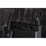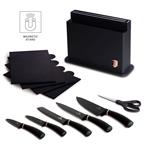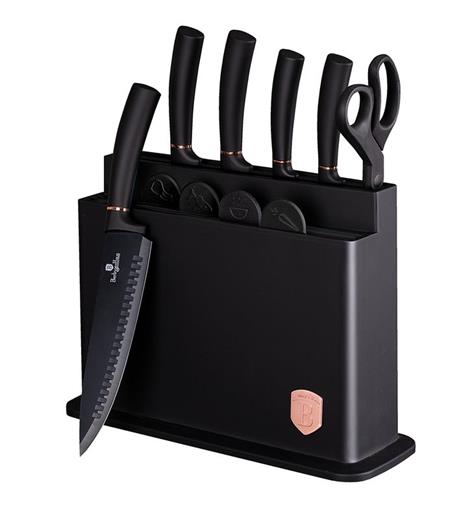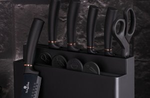 Sada Berlingerhaus Black Rose Collection se skládá z 5 nožů, nůžek a 4 krájecích prkének. Perfektně ostré čepele jsou potažené nepřilnavým povrchem. Díky laserovému broušení na nich krájené potraviny neulpívají. Antibakteriální úprava zajistí, že se při krájení nepřenáší nežádoucí pachy. Suroviny si navíc zachovají všechny prospěšné vitamíny a výživové hodnoty. Stylový a do detailu sladěný design kolekce Black Rose elegantně doplní každou kuchyni.