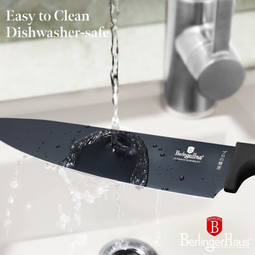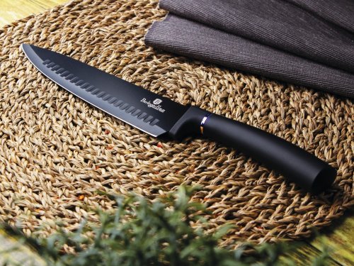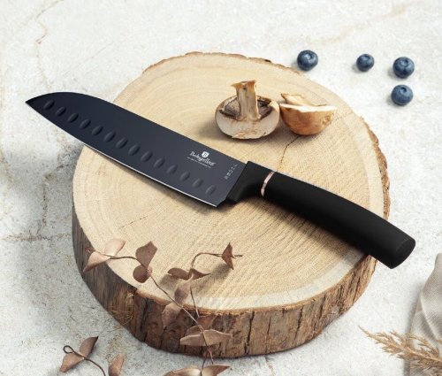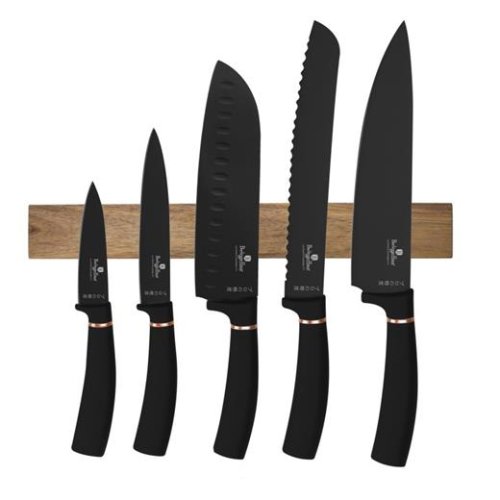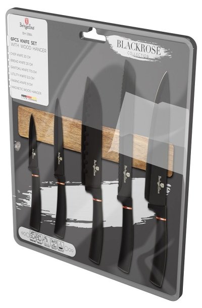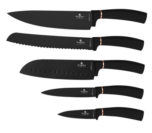 Sada Berlingerhaus Black Rose Collection se skládá z 5 nožů a magnetického držáku. Perfektně ostré čepele jsou potažené titanovým nepřilnavým povrchem. Antibakteriální úprava zajistí, že se při krájení nepřenáší nežádoucí pachy. Suroviny si navíc zachovají všechny prospěšné vitamíny a výživové hodnoty.