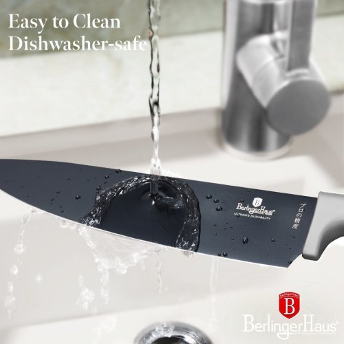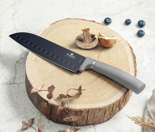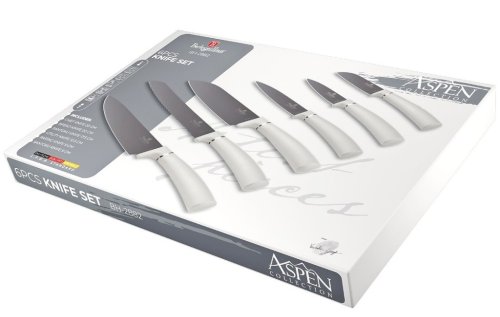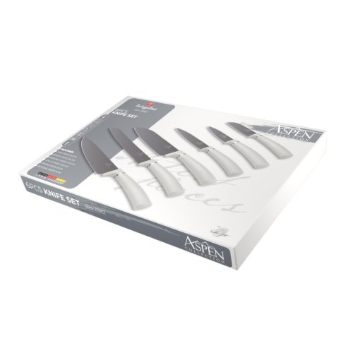 Sada Berlingerhaus Aspen Collection se skládá z 6 nožů v magnetické dárkové krabičce. Ostré čepele jsou potažené šedým nepřilnavým povrchem s antibakteriální úpravou. Krájené potraviny na nich neulpívají. Snadno je tedy očistíte.