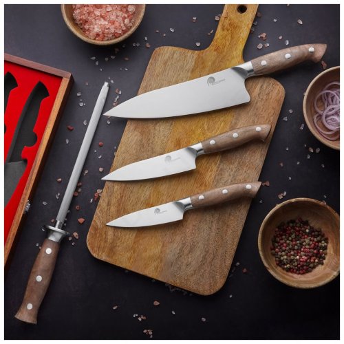 Sada nožů, která potěší každého vášnivého kuchaře. Elegantní čtyřdílná sada Dellinger Walnut obsahuje 3 kvalitní nože z německé oceli HRC 56–58 a karbonovou ocílku, která udrží ostří vždy perfektní. Vše je uloženo v luxusní dárkové krabici z akátového dřeva s kovovým zavíráním.