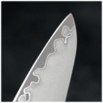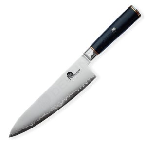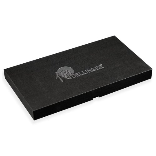 Sada Dellinger Okami vznikla pro ty, kdo hledají maximální kontrolu, ostrost a odolnost. Jádro z japonské oceli AUS-10 je vložené mezi dvě vrstvy nerezové oceli, čímž vzniká robustní a zároveň flexibilní čepel. Povrchová úprava typu stonewashed skrývá jemné škrábance a působí elegantně. Nože jsou broušené v úhlu 15°, díky čemuž snadno krájí i jemné suroviny bez deformace. Rukojeti z materiálu G-10 jsou ergonomické, pevné a ozdobené stylovým mozaikovým nýtem se samurajským znakem.