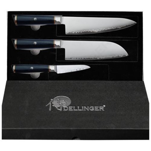 Profesionální sada nožů, která vyniká designem i výkonem. Dellinger Okami 3-layers AUS10 nabízí jádro z japonské oceli AUS-10 (HRC 58–62), matnou stonewashed úpravu a precizní ostří s úhlem broušení 15°. V sadě najdete tři nejpoužívanější nože – Chef, Santoku a okrajovací, elegantně uložené v dárkové krabičce.