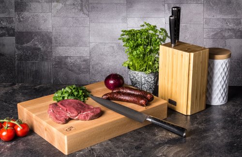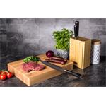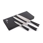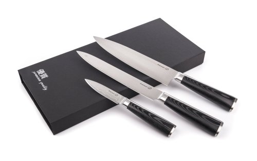 Sada nožů z damaškové oceli v kuchyni jsou skvělou volbou. Damascénská ocel má vyšší tvrdost a odolnost vůči opotřebení, díky vzácné a unikátní kresbě oceli navíc získáte jedinečnou kombinaci krásy a luxusu s vynikajícími řeznými vlastnostmi. V sadě najdete nůž šéfkuchaře a krájecí nůž s délkou 20 cm a jeden univerzální nůž s čepelí o délce 9 cm.