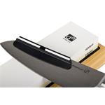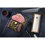Sada nožů z damaškové oceli v kuchyni je skvělou volbou. Damascénská ocel má vyšší tvrdost a odolnost vůči opotřebení, díky vzácné a unikátní kresbě oceli navíc získáte jedinečnou kombinaci krásy a luxusu s vynikajícími řeznými vlastnostmi. V sadě najdete nůž šéfkuchaře a krájecí nůž s délkou 20 cm, Santoku nůž s délkou 13 cm a jeden univerzální nůž s čepelí o délce 9 cm. Dále pak bambusový blok pro bezpečné ukládání nožů a brusný kámen se zrnitostí 1000/6000 s vodítkem.