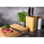 Designový stojánek na nože je vyroben z ekologického bambusového dřeva. Dřevo je nejlepším materiálem pro uskladnění nožů. Ostří nožů se při klouzání po dřevě netupí tak, jako je tomu u jiných tvrdších materiálů. Ve stojánku má každý z nožů své bezpečné místo. Správnou péčí o nože a jejich ukládáním do speciálního dřevěného bloku prodloužíte životnost nožů.