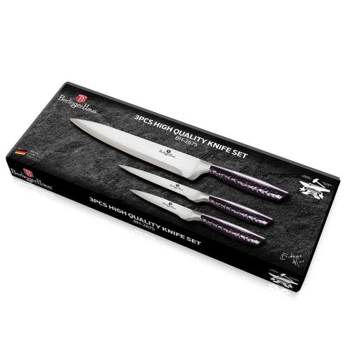 Sada nožů nerez 3 ks Purple Eclipse Collection je výbornou alternativou pro kuchaře různých úrovní, na jejíž výrobu byl použit kvalitní materiál: nerez ocel s nepřilnavým povrchem, vynikají perfektní ostrostí čepele a designem. Velmi oceníte i ergonomicky tvarovanou rukojeť, díky které se vám nože budou skvěle držet. Celá sada je dílem výrobce BERLINGERHAUS, jež se výrobě nožů věnuje poměrně dlouho a jsou řádně odzkoušeny.
