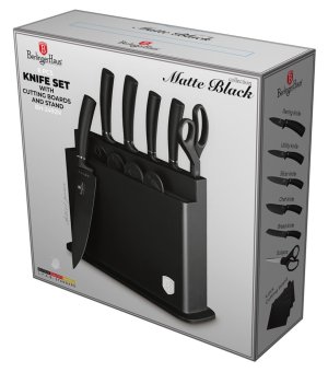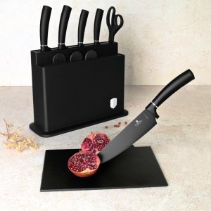 - Materiál: nerezová ocel s černou nepřilnavou vrstvou- Krájecí deska 4 ks- Černý stojan- Nůž na chléb 20 cm- Kuchařský nůž 20 cm- Krájecí nůž 20 cm- Užitkový nůž 12,5 cm- Nůž na okrajování 9 cm- Nůžky- …