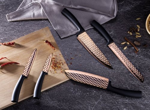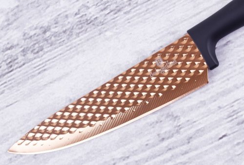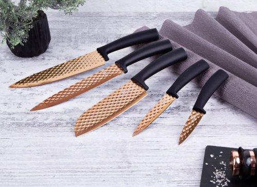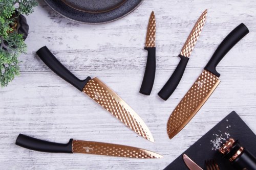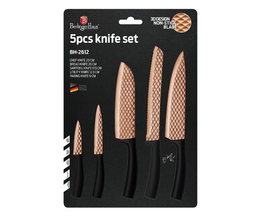 Sada nožů s nepřilnavým povrchem 5 ks Black Rose Collection je výbornou alternativou pro kuchaře různých úrovní, na jejíž výrobu byl použit kvalitní materiál: nerez ocel s nepřilnavým povrchem, vynikají perfektní ostrostí čepele a designem. Velmi oceníte i ergonomicky tvarovanou rukojeť, díky které se vám nože budou skvěle držet. Celá sada je dílem výrobce BERLINGERHAUS, jež se výrobě nožů věnuje poměrně dlouho a jsou řádně odzkoušeny.