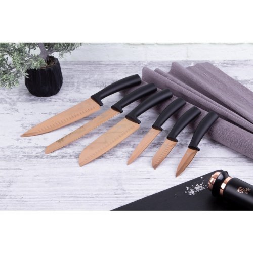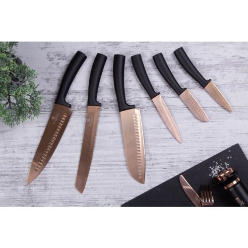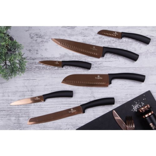 Sada nožů s nepřilnavým povrchem 11 ks Rosegold Metallic Line je výbornou alternativou pro kuchaře různých úrovní, na jejíž výrobu byl použit kvalitní materiál: nerez ocel s nepřilnavým povrchem, vynikají perfektní ostrostí čepele a designem. Velmi oceníte i ergonomicky tvarovanou rukojeť, díky které se vám nože budou skvěle držet. Celá sada je dílem výrobce BERLINGERHAUS, jež se výrobě nožů věnuje poměrně dlouho a jsou řádně odzkoušeny.