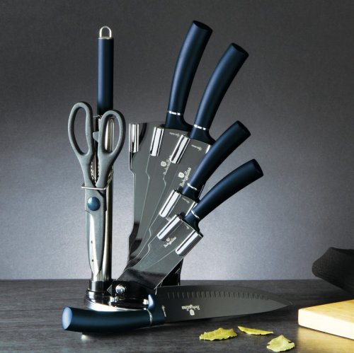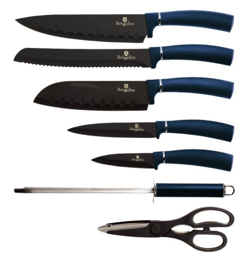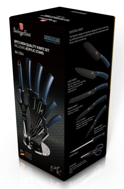 Sada nožů ve stojanu 8 ks Aqumarine Metallic Line je výbornou alternativou pro kuchaře různých úrovní, na jejíž výrobu byl použit kvalitní materiál: nerez ocel s nepřilnavým povrchem, vynikají perfektní ostrostí čepele a designem. Velmi oceníte i ergonomicky tvarovanou rukojeť, díky které se vám nože budou skvěle držet. Celá sada je dílem výrobce BERLINGERHAUS, jež se výrobě nožů věnuje poměrně dlouho a jsou řádně odzkoušeny.
