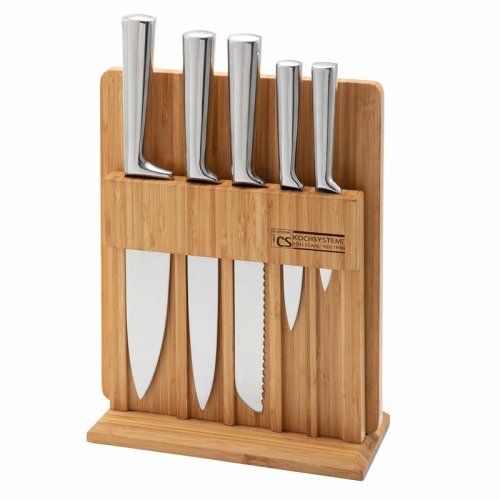 dřevěný stojan s pěti nerezovými noži a prkénkem- celonerezové provedení z jednoho kusu oceli- laserem broušená čepel pro dlouhotrvající maximální ostrost- precizní zpracování tradiční německé nožířské značky CS Solingen- silné odolné nože s dlouhou životností- nože mají ergonomicky tvarované rukojeti s pevným úchopem a bezpečnostní ochranou prstů- sada 7 ks obsahuje, (délky čepelí):- šéfkuchařský nůž 20 cm- porcovací nůž 20 cm- nůž na pečivo 20 cm- univerzální nůž 13 cm- kuchyňský nůž 9 cm- dřevěné prkénko zasazené ve stojanu- dřevěný stojan