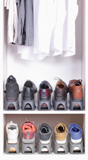 Plastový organizér na obuv. Vhodné pro obuv velikosti 38-45, rozměry: 10,5 x 14,5 x 27 cm, materiál plast, barva antracit, protiskluzový povrch, balení obsahuje 4 ks.