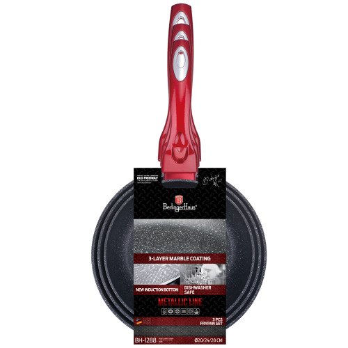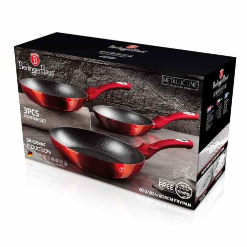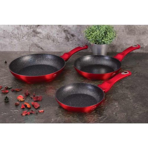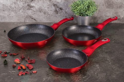 - materiál: kovaný hliník s mramorovým povrchem- barva: červená metalická- Sada 3 ks obsahuje:- Pánev pr. 20 x 4,2 cm- Pánev pr. 24 x 5 cm- Pánev pr. 28 x 5,5 cm- 3 vrstvý nepřilnavý povrch s mramorovým …