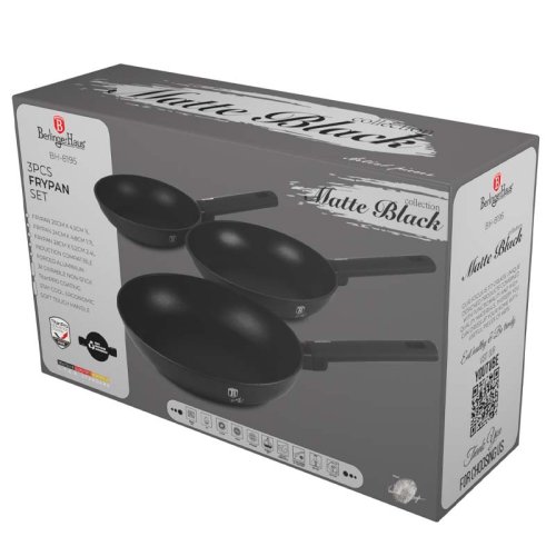 Tato sada pánví je vyrobena z kovaného hliníku s nepřilnavým povrchem TitanPro, který zajišťuje vysokou kvalitu a odolnost. Sada obsahuje tři pánve různých velikostí: pánev o průměru 20 cm s objemem 1,0 litru, pánev o průměru 24 cm s objemem 1,7 litru a grilovací pánev o průměru 28 cm s objemem 2,1 litru. Matná černá barva a minimalistický styl dodávají pánvím moderní vzhled. Ergonomická rukojeť Soft Touch Stay Cool zajišťuje pohodlné a bezpečné používání.