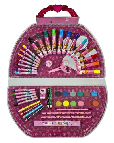 Sada potřeb do školy v kufříku s ouškem obsahuje: 6 mini pastelek, 12 fixů, 12 voskovek, 12 vodových barev se štětcem a paletou, guma, 2 tužky, ořezávátko, pravítko a nůžky.