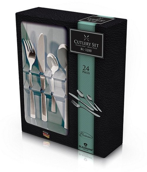• Sada 24 ks obsahuje:- 6 x jídelní nůž- 6 x jídelní vidlička- 6 x polévková lžíce- 6 x čajová lžička- materiál: leštěná nerezová ocel- lesklé provedení- snadné čištění- dárkové balení- značka: Blaumann