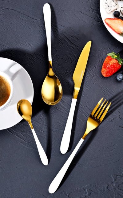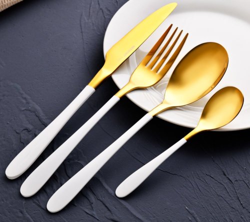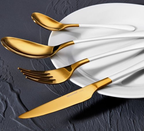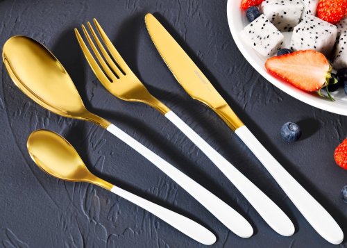 • Nerezové příbory. Bergner, bílá kolekce Lisboa 16 nerezových příborů, zaručující velkou odolnost a dlouhou životnost příborů. •Kompletní a moderní příbory. Skládá se ze 4 lžic, 4 nožů, 4 vidliček a 4 čajových lžiček. Celkem 16 jídelních souprav vyrobených z nerezové oceli. •Elegantní design. Je ideální pro zvláštní příležitosti, jídlo nebo zvláštní událost na oslavu s blízkými. Přináší na stůl dotek odlišnosti a dobrého vkusu. • Nabízí moderní dotek. Sada příborů je zlatá s matně bílou rukojetí. Mají moderní, lesklý povrch a jiný, elegantní styl. •Praktický. Tyto nerezové příbory nabízejí vynikající vlastnosti. Jsou snadno omyvatelné a vhodné do myčky. Zachovají si odolnost a vzhled.16dílná sada příborů sestávající ze 4 stolních nožů 23,5 cm, 4 stolních vidliček 21 cm, 4 polévkových lžic 21,5 cm a 4 čajových lžiček 14 cm. Vyrobeno z vysoce kvalitní odolné nerezové oceli s lesklým zlatým PVD povrchem a červeně lakovanou rukojetí. Sada příborů, která je nejen mimořádně funkční, ale také oblékne váš stůl elegancí bílé. Snadné čištění, doporučujeme ruční čištění pro prodloužení životnosti produktu.