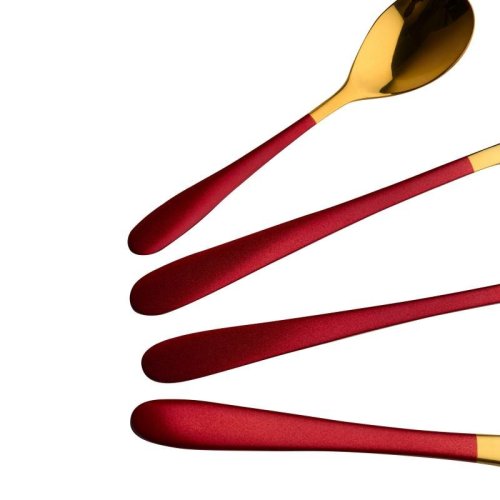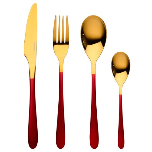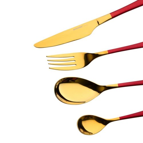 • Nerezové příbory. Bergner, červená Lisboa kolekce 16 nerezových příborů zaručujících velkou odolnost a dlouhou životnost příborů. • Sada příborů sestávající ze 4 lžic, 4 nožů, 4 vidliček a 4 čajových lžiček. • Elegantní design. Je ideální pro zvláštní příležitosti, jídlo nebo zvláštní událost na oslavu s blízkými. Přináší na stůl dotek odlišnosti a dobrého vkusu. • Vyrobeno z pozlacené nerezové oceli. •Snadno omyvatelné, vhodné do myčky.6dílná sada příborů sestávající ze 4 stolních nožů 23,5 cm, 4 stolních vidliček 21 cm, 4 polévkových lžic 21,5 cm a 4 čajových lžiček 14 cm. Vyrobeno z vysoce kvalitní odolné nerezové oceli s lesklým zlatým PVD povrchem a červeně lakovanou rukojetí. Sada příborů, která je nejen mimořádně funkční, ale také oblékne váš stůl elegancí červené. Snadné čištění, doporučujeme ruční čištění pro prodloužení životnosti produktu.