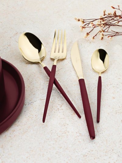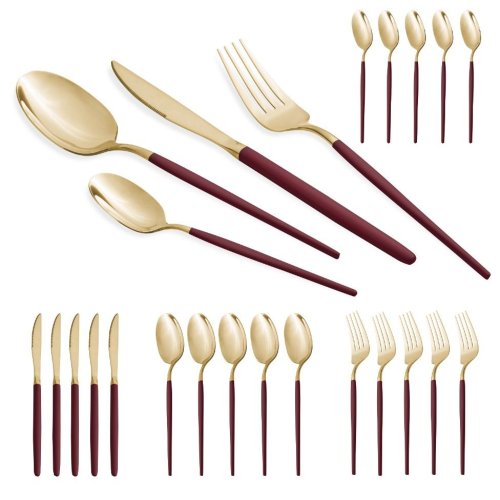 - Materiál: Nerezová ocel s leštěnou povrchovou úpravou- Sada obsahuje:- Nůž 6 ks 7,0 mm- Vidlička 6 ks 4,0 mm- Lžíce 6 ks 4,0 mm- Čajová lžička 6 ks 2,7 mm- Barva: zlatá champagne / červená burgundy- …