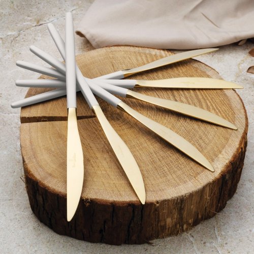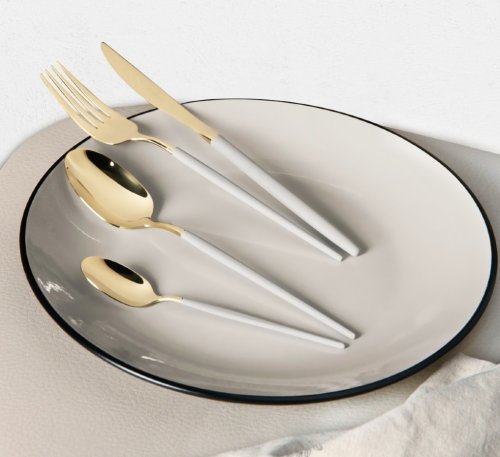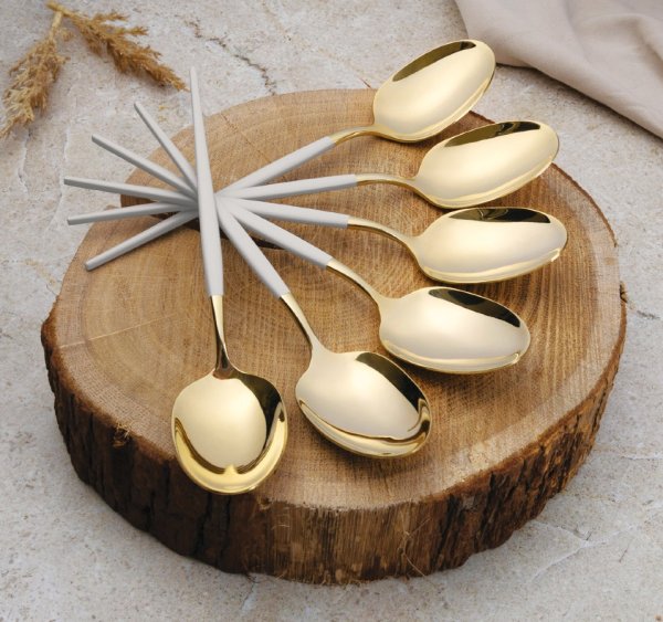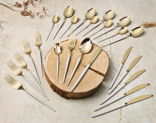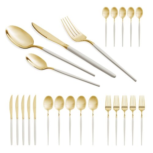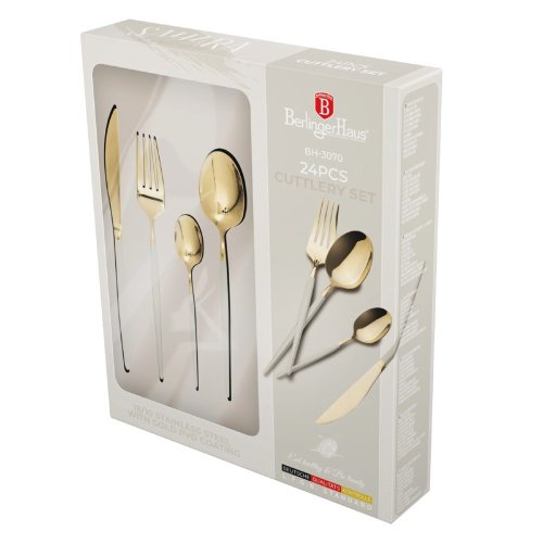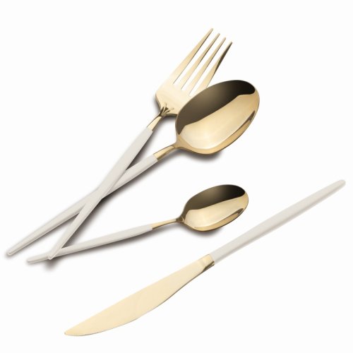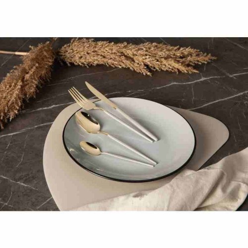 - Materiál: Nerezová ocel s leštěnou povrchovou úpravou- Sada obsahuje:- Nůž 6 ks 7,0 mm- Vidlička 6 ks 4,0 mm- Lžíce 6 ks 4,0 mm- Čajová lžička 6 ks 2,7 mm- Barva: zlatá champagne / krémová sahara- …