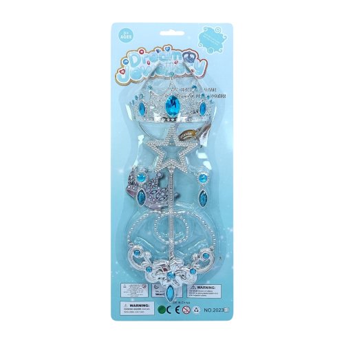 Proměňte se v okouzlující princeznu! Tato nádherná dětská sada obsahuje vše, co malá královská duše potřebuje ke své proměně – stříbrnou korunku, kouzelnou hůlku, elegantní náhrdelník a třpytivé náušnice. Některé kousky jsou zdobeny zářivými modrými kamínky, které dodávají celé sadě pohádkový vzhled. Ideální na karneval, narozeninovou oslavu, hraní na princeznu nebo jen tak pro radost.