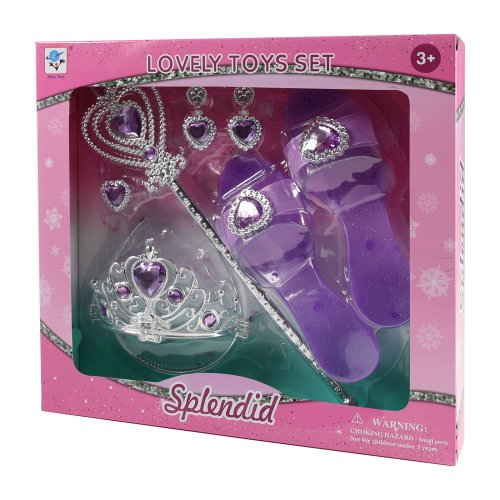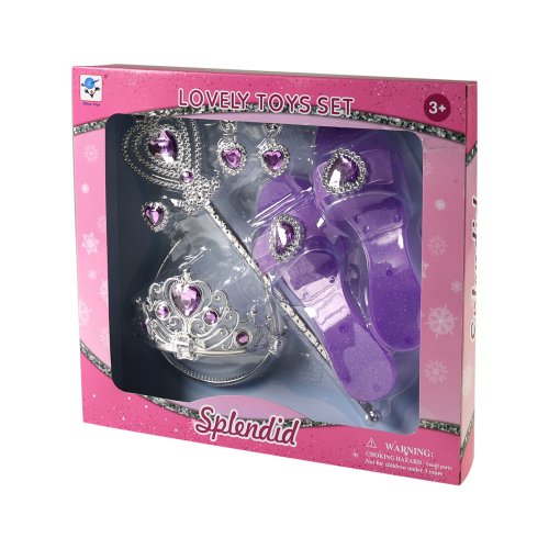 Proměň se v opravdovou princeznu! Tato krásná sada obsahuje vše, co malá parádnice potřebuje ke svým pohádkovým dobrodružstvím. Elegantní střevíčky, korunku, náušnice, prstýnek a kouzelnou hůlku. Díky stříbrno-fialové barevné kombinaci působí celý set velmi slavnostně a okouzlujícím dojmem. Hodí se nejen na hraní doma, ale i na karnevaly, narozeninové oslavy či dětské párty.