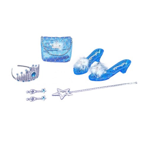 Která z holčiček by nezatoužila potom, stát se alespoň na chvíli krásnou princeznou! Set obsahuje střevíčky, kabelku, čelenku, korunku, náušnice a hůlku. Všechny prvky této sady jsou perfektní doplňky ke kostýmu. Velikost střevíčků je cca 19 cm. Doporučeno pro děvčata od 3 let.