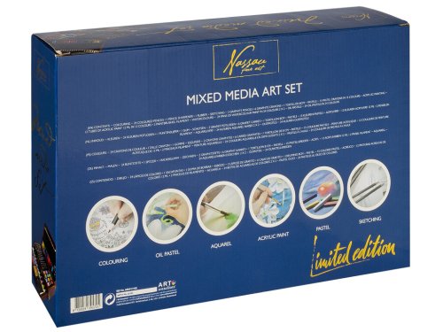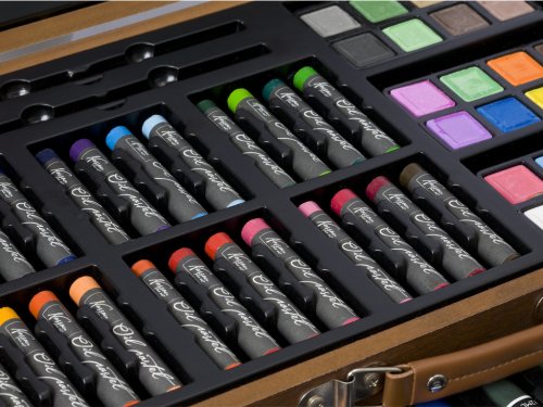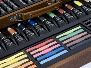 Sada pro malíře v dřevěném kufříku – dřevěný rozkládací kufřík obsahuje vše pro malíře – barevé křídy, pastelky, barvy, ořezávátko, gumu, štětce atd. celkem 112 ks.