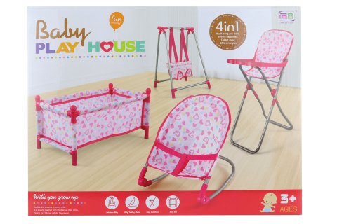 Sada pro panenku 4v1 obsahuje lehátko, houpačku, jídelní židličku a postýlku. Rozměr balení cca 37 x 47,5 x 10 cm. Věk 3+