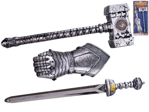 Zbraně set. Obsah balení - rukavice, meč 50 cm, kladivo 39 cm.