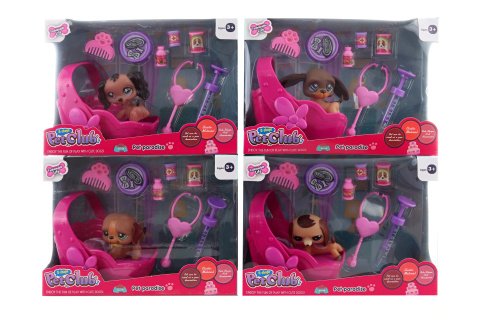 Krásná veselá sada se zvířátkem a postýlkou. Balení dále obsahuje menší doplňky - stetoskop, injekci, hřebínek, misku, plechovku s jídlem a 2 lahvičky s medicínou. Materiál plast. Velikost zvířátka cca 6 cm. Rozměry balení cca 20x15x10 cm. Věk 3+