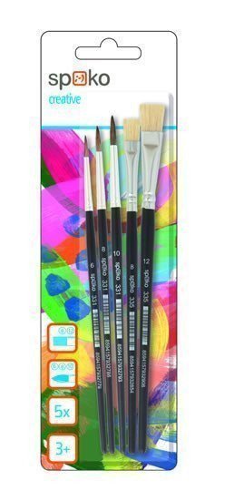 Školní sada štětců v mixu velikostí - ploché štětinové a kulaté vlasové. Balení: 5 kusů na blistru.
