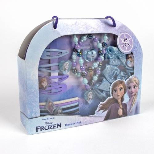 Sada šperků/vlasových doplňků v kabelce Ledové království – sada v praktické kabelce obsahuje 1× prstýnek, 1× náramek, 1 náhrdelník, 1× gumičku s mašlí, 6× elastickou gumičku, 4× sponku ve dvou barvách a 6 samolepek.