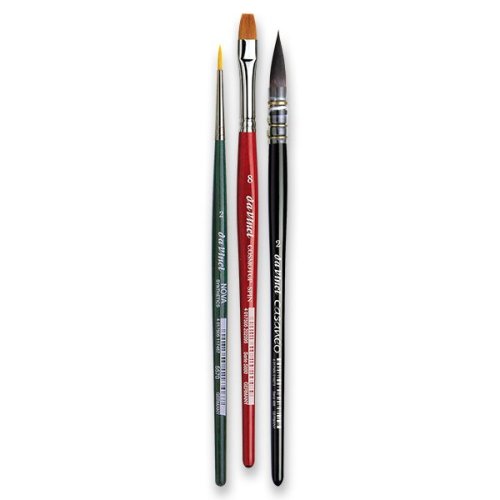 Souprava syntetických štětců osvědčené kvality, od německého výrobce s dlouholetou tradicí. Souprava obsahuje tři druhy štětců: Nova - kulatý štětec velikosti 2 s vlákny různých průměrů, které zvyšují absorpční kapacitu oproti vláknům stejného průměru. Bezešvá “stříbrná” objímka z poniklované mosazi. Casaneo - kulatý, tzv. “francouzský” štětec velikosti 2 s vlákny s mikroskopickou strukturou, které umožnují vysokou absorpci barvy. Vlákno bylo speciálně vyvinuto jako náhrada přírodních veverčích chlupů, má extrémně vysokou kapacitou pohlcování barev a mimořádnou elasticitu. Ideální pro malbu akvarelem a tekutými akrylovými barvami. Cosmotop-Spin – plochý štětec velikosti 8. Nejjemnější extra hladké světle hnědé syntetické vlákno. Bezešvá „stříbrná“ objímka z poniklované mosazi s krátkou červeně lakovanou esagonální rukojetí, která zabraňuje kutálení štětce. Ideální pro malbu akvarelem, stejně tak i pro kreslení jemných detailů. Vhodné pro malování botanických motivů.